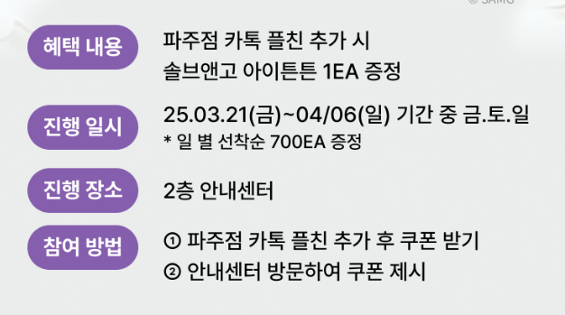 운영 시간: 행사 기간 동안 아울렛 운영 시간은 평소와 동일하나, 일부 이벤트는 특정 시간대에만 진행될 수 있습니다.