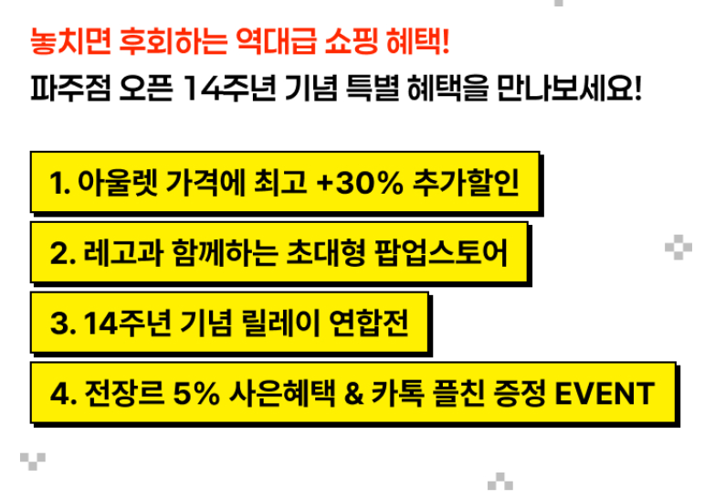 파주 프리미엄 아울렛이 개점 14주년을 맞아 특별한 할인 행사를 진행합니다. 이번 행사는 2025년 3월 21일부터 4월 6일까지 약 2주간 진행되며, 다양한 브랜드에서 최대 70% 할인 혜택을 제공합니다. 이번 세일 및 혜택 소식을 전해드리겠습니다.