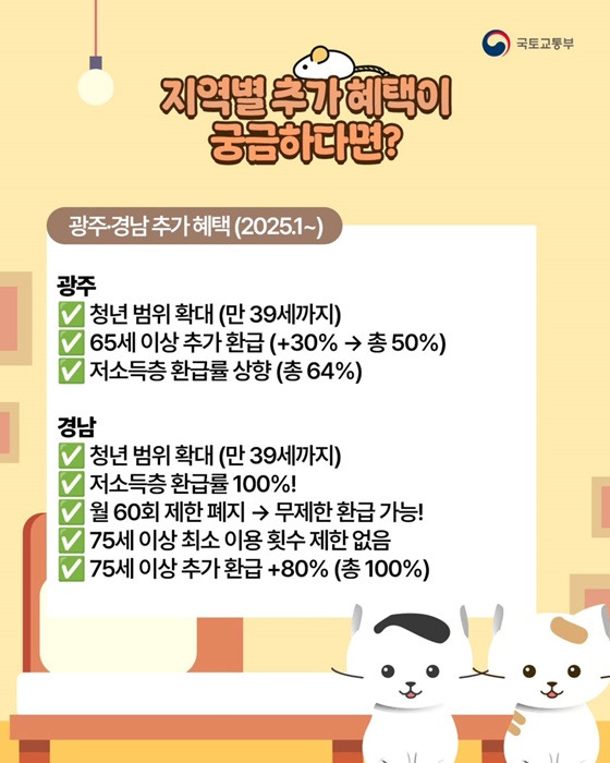 - 경남: 청년 범위 확장과 저소득층 환급률이 100%로 상향 조정됩니다. 75세 이상은 최소 이용 횟수 제한이 없으며, 추가 환급률이 80%로 제공됩니다.