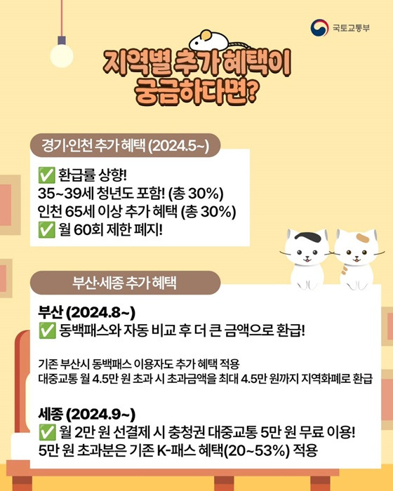 - 세종 (2024.9~): 월 2만 원 선결제를 하면 충청권 대중교통 5만 원 무료 이용 혜택을 받을 수 있으며, 5만 원을 초과하는 금액에 대해서는 기존 K-패스 혜택이 적용됩니다.
